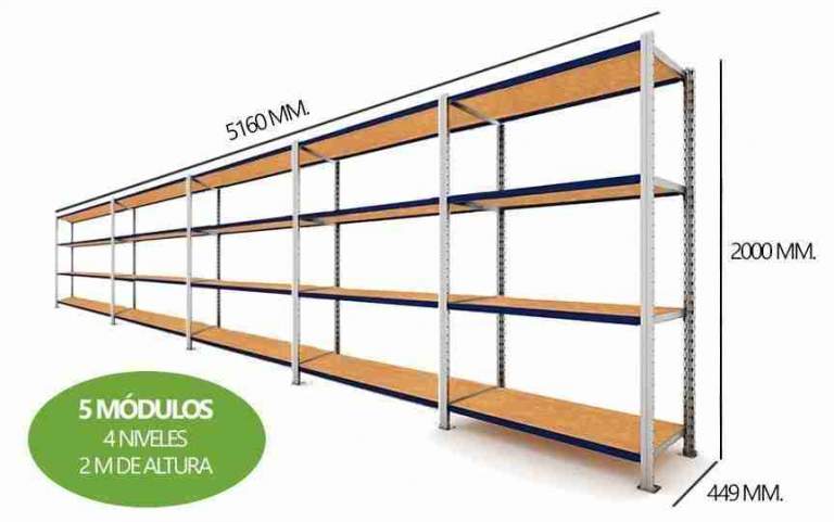 Conjunto estanterías metálicas cargas ligeras 2,0mX1,0mX0,4m. Compuesto por 5 estanterías de 4 estantes con capacidad para 300 Kg. por nivel.