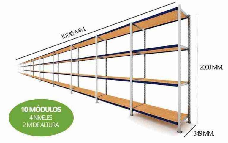 Conjunto estanterías cargas ligeras 2,0mX1,0mX0,3m. Compuesto por 10 estanterías de 4 estantes con capacidad para 300 Kg. por nivel.