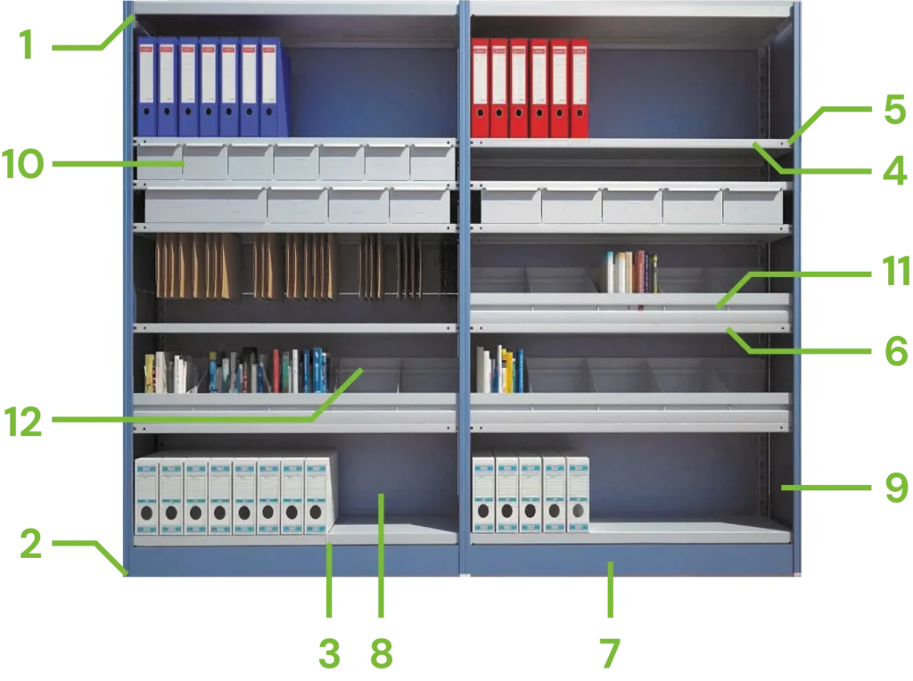 Los pliegues de los estantes, permiten la sujeción de carpetas colgantes, sin necesidad de colocar ningún accesorio.