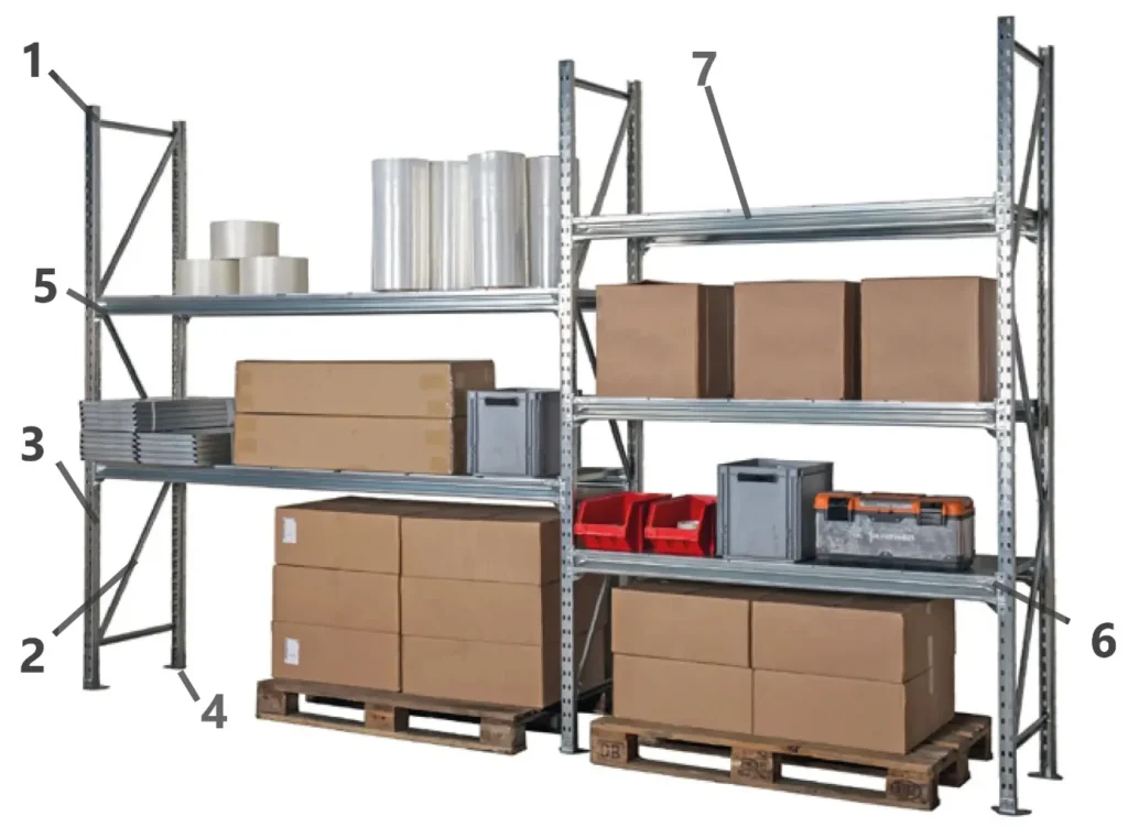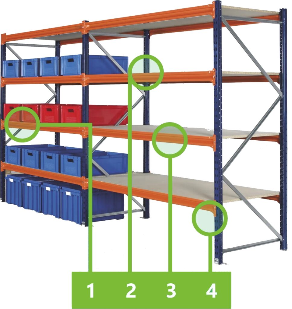 Elementos horizontales dispuestos entre los bastidores, que conforman los niveles de carga. Soportan directamente el peso de la mercancía. Se acoplan a los puntales por los conectores situados a ambos extremos del larguero.