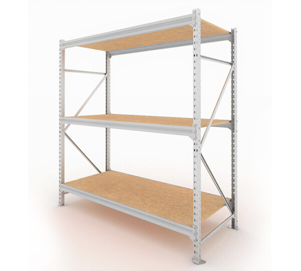 Estantería fabricada en acero galvanizado ideal para cargas muy voluminosas. Acabado pregalvanizado.